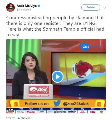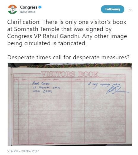 “There is only one visitors’ register at Somnath Temple that was signed by the Congress VP Rahul Gandhi. Any other image being circulated is fabricated,” the Congress clarified.