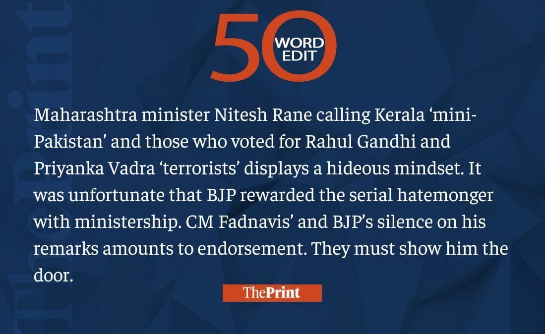 Nitesh Rane’s ‘mini-Pakistan’ remark is appalling. CM Fadnavis, BJP must show him the door