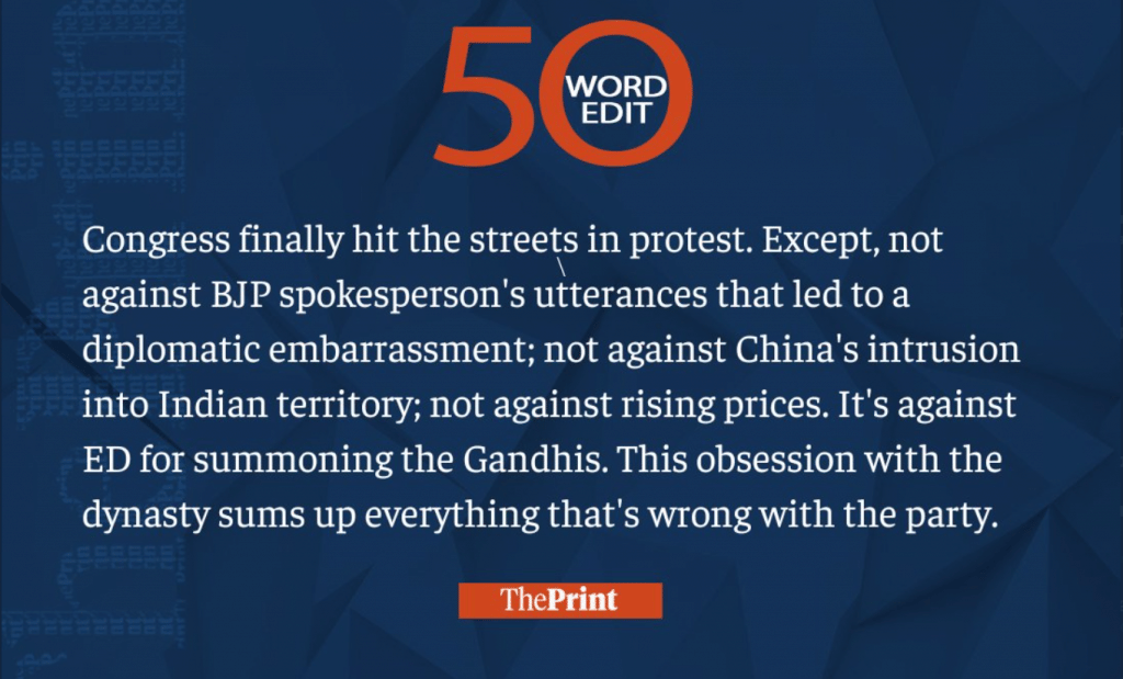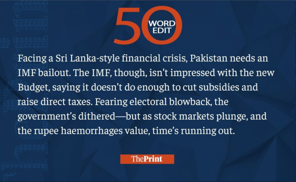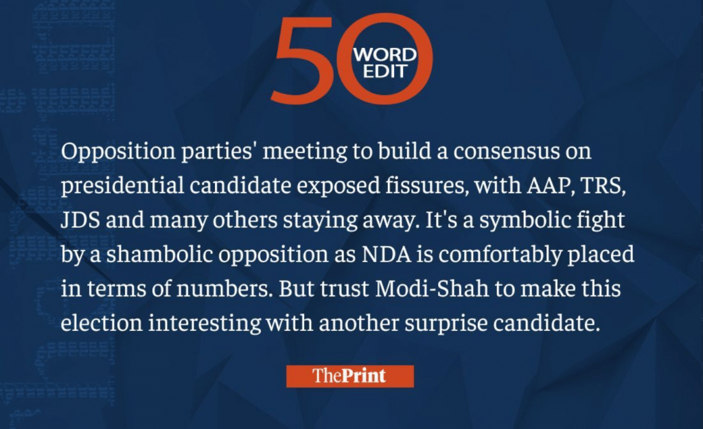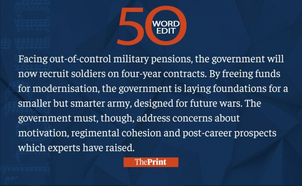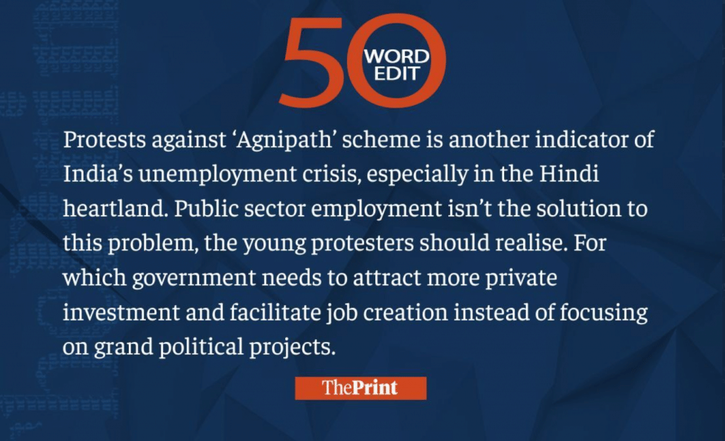 This week, we saw the BJP government releasing the Agnipath scheme and citizens protesting against it, political parties staying out of presidential elections, and Pakistan trying to waddle through its economic crisis. Read our 50-word editorials on them and much more.