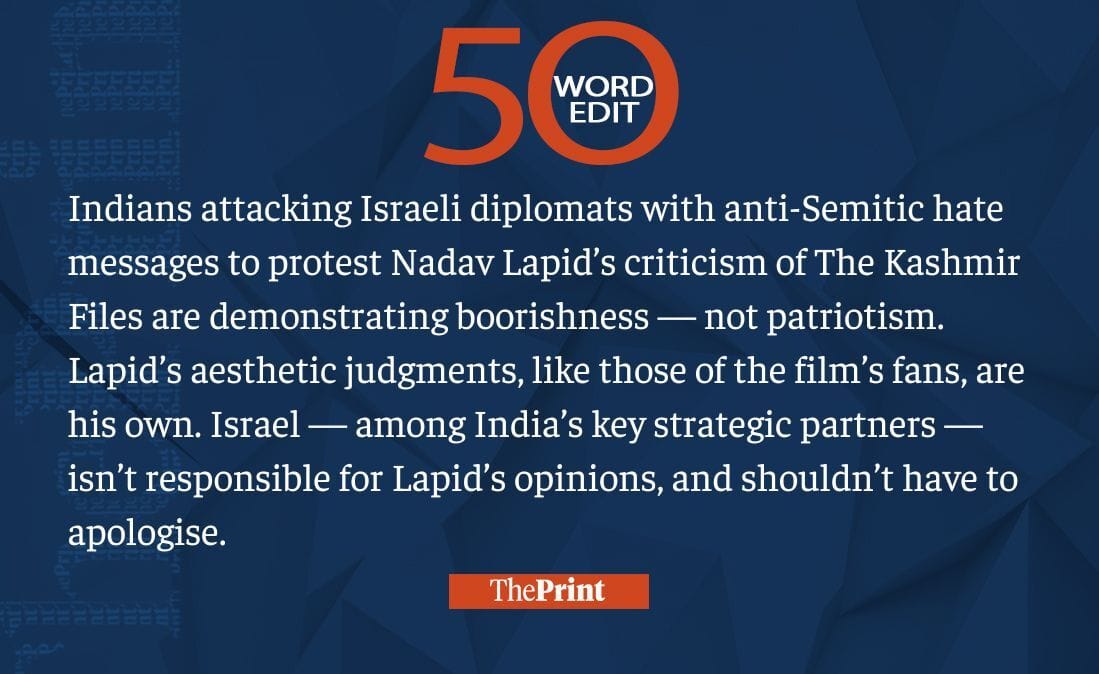 Filmmaker Nadav Lapid’s criticism of Kashmir Files is his opinion. Israel needn’t apologise