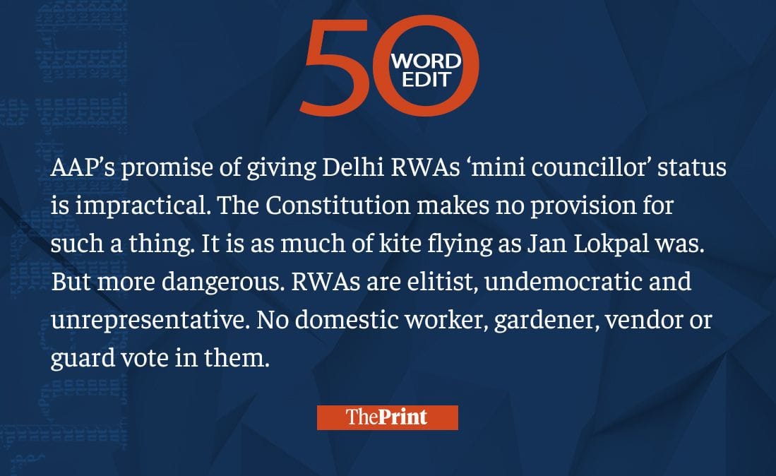 Elitist Delhi RWAs can’t have ‘mini councillor’ status. AAP’s promise impractical, dangerous
