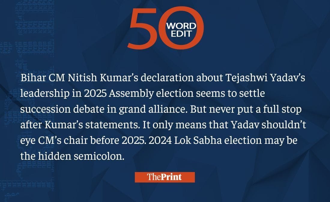 This week, we saw Bihar CM Nitish Kumar declare Tejashwi Yadav’s leadership in 2025, MP Congressman Raja Pateria’s reprehensible remark ‘kill Modi’ and new data protection bill. Read our 50-word editorials on them and much more.