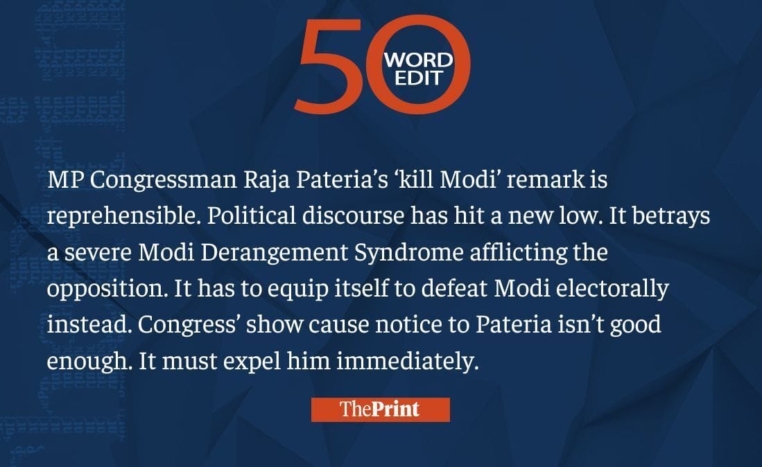 Raja Pateria’s ‘kill Modi’ remark new low for Congress. Focus on defeating PM electorally instead