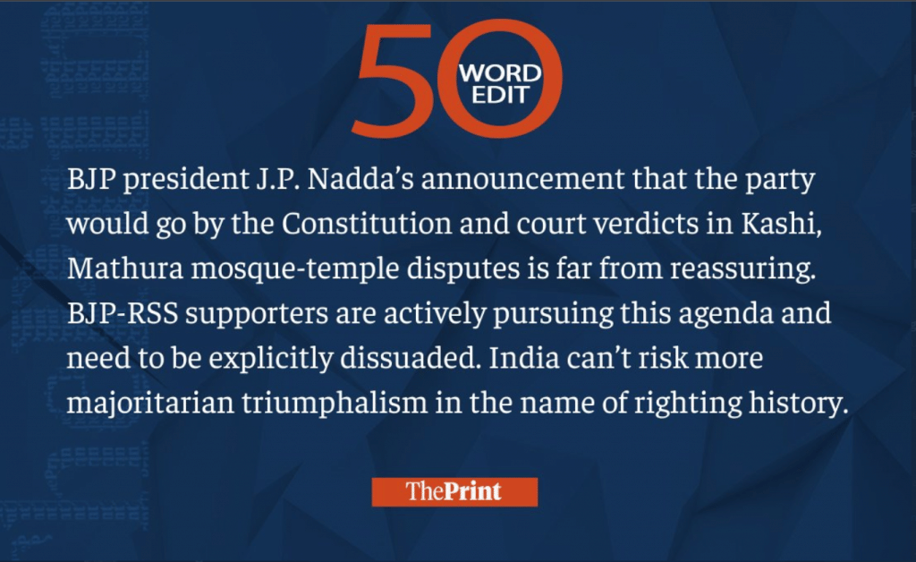 This week, we saw J.P. Nadda announcing the BJP will go by the Constitution and court verdicts on the Kashi dispute, women UPSC toppers, singer Sidhu Moose Wala and Bihar caste census. Read our 50-word editorials on them and much more.