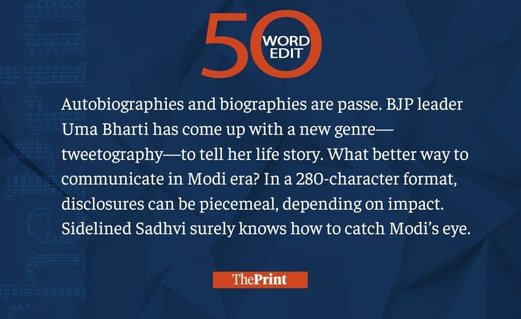 Not biography, BJP’s Uma Bharti has a ‘tweetography’. She knows how to catch Modi’s eye