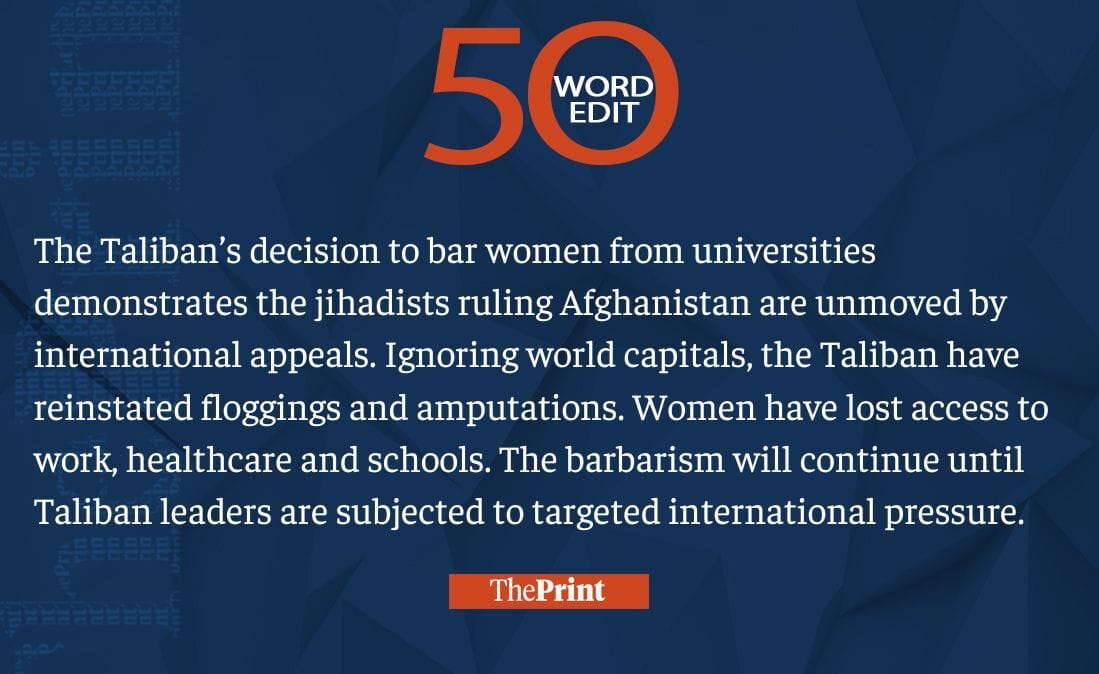 This week, we saw the Taliban barring women from entering Afghan universities, Pakistani minister Shazia Marri issuing nuclear threats to India and calls for trade ban with China. Read our 50-word editorials on them and much more.