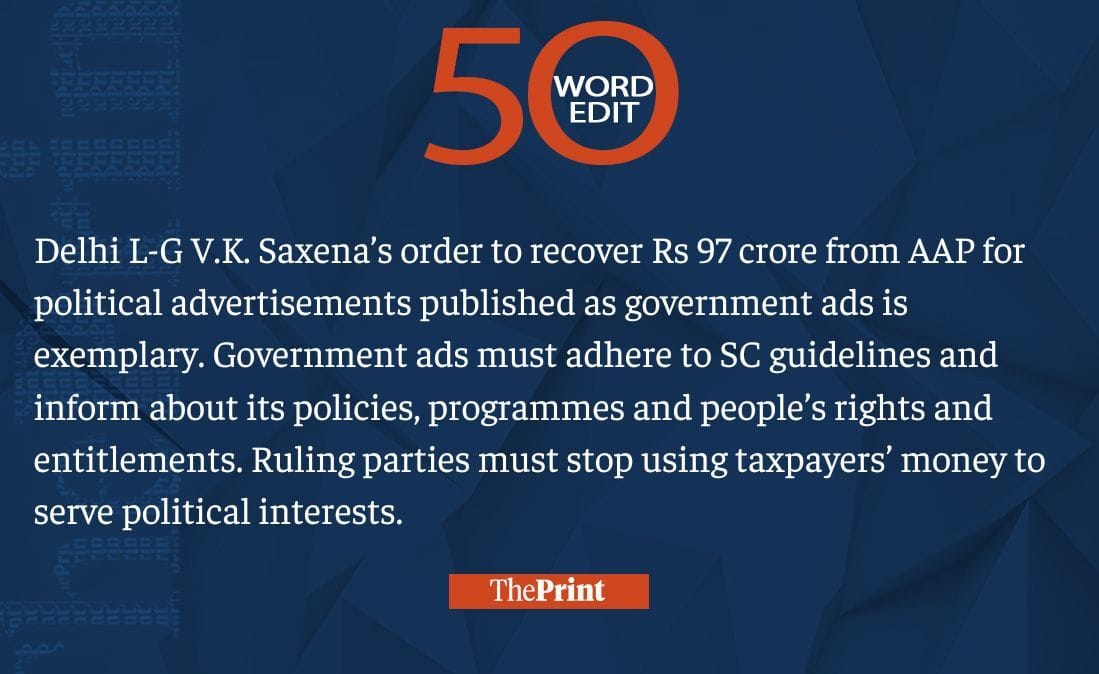 Govt ads must adhere to SC guidelines. L-G seeking to recover Rs 97 cr from AAP exemplary