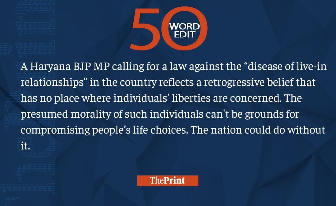 BJP MP asking for law against live-in relationships is regressive. His presumed morality can’t dictate liberty