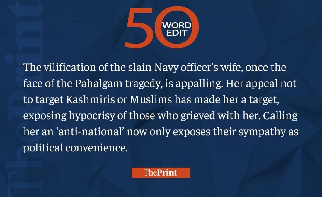 The vilification of the slain Navy officer’s wife, once the face of the Pahalgam tragedy, is appalling. Her appeal not to target Kashmiris or Muslims has made her a target, exposing hypocrisy of those who grieved with her. Calling her an ‘anti-national’ now only exposes their sympathy as political convenience.