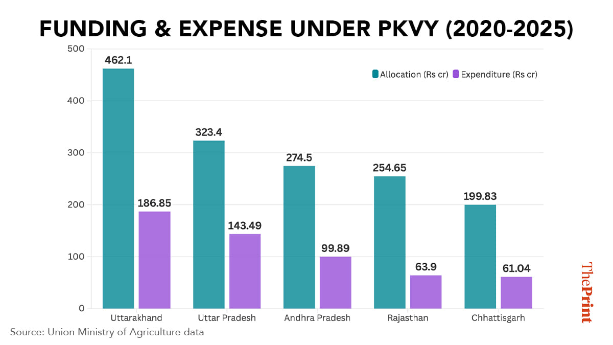 Ministry data on allocation and expenditure under the PKVY from 2020 to 2025 shows that states like Uttar Pradesh, Uttarakhand and Andhra Pradesh had the highest allocation and spending, which is reflected in their high beneficiary numbers.