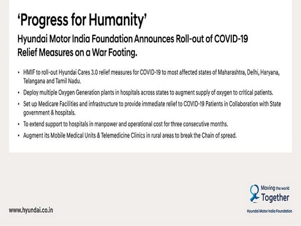 The relief measures have been specially developed with the focus of addressing the needs emerging out of the current crisis. Hyundai is aiming at helping people and infrastructure cope with the second wave of the COVID-19 pandemic in India. To ensure timely assistance is delivered to highly affected cities and states the company is evaluating all options to expedite the deployment of these resources on a war footing. Additionally, Hyundai had organized a vaccination drive for its staff aged above 45 in the manufacturing facility through the office of the Sriperumbudur Government Primary Health Centre and will continue these efforts to help overcome the pandemic.