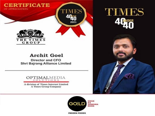 New Delhi [India], June 1 (ANI/NewsVoir): Archit Goel, Director and CFO, Shri Bajrang Alliance Limited from India has been chosen as one amongst the “Times 40 Under 40”, an exclusive platform created by Optimal Media Solutions under the Times Group banner that identifies, encourages and provides recognition to the top 40 brightest young entrepreneurs, leaders and innovators who are under 40 years of age and have been game changers in true sense.