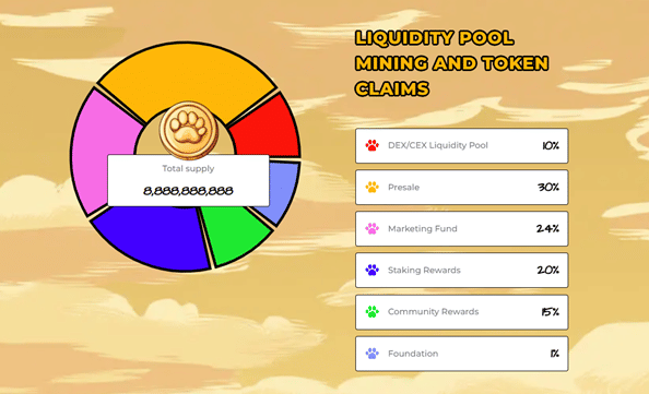 - Total Supply: 8,888,888,888 tokens, allocated across multiple sectors, including presale and community rewards.