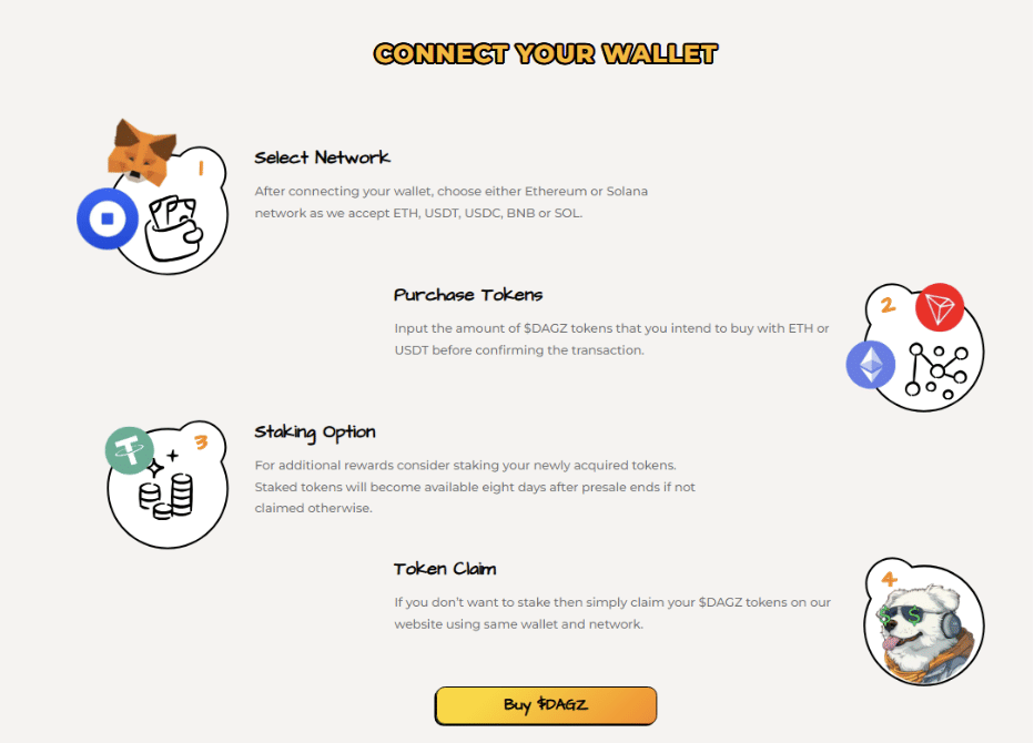 Getting your paws on $DAGZ during the presale is simple and only takes a few clicks.