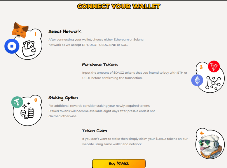 Getting your paws on $DAGZ is super simple, even if you’re new to crypto.