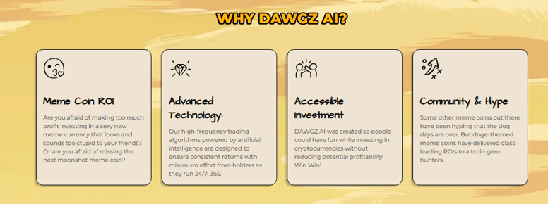 Dawgz AI is a meme coin that delivers. It’s fun and profitable, thanks to AI tools that supercharge your returns. Triple digit ROI potential with meme coin energy that gets heads turning and bags pumping.