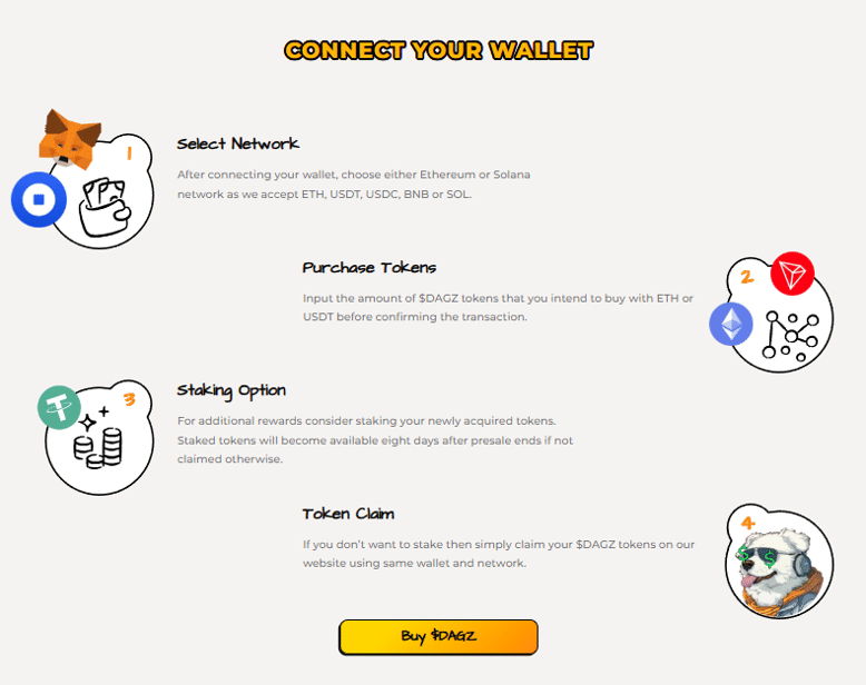 - Purchase $DAGZ Tokens: Once connected, input the amount of $DAGZ tokens you want to buy with your preferred cryptocurrency (ETH, BNB, SOL, USDT, or USDC). Confirm your transaction.