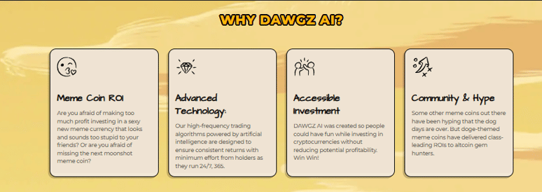 - AI-Powered Trading: Utilizing advanced algorithms, Dawgz AI offers a unique approach to investing, running 24/7 to ensure consistent returns with minimal effort from holders.