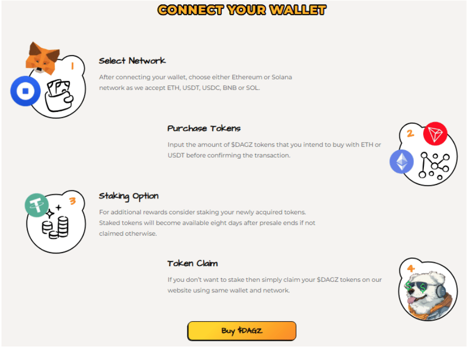 Buying Dawgz AI tokens ($DAGZ) is straightforward and takes just a few minutes: