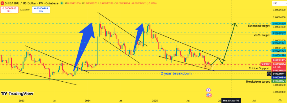 Analyst predictions on Shiba Inu (SHIB) have been misleading in recent days, with projections of a small trading range of $0.00001004 – $0.00001192 in the year 2025, as highlighted by predictions on CoinCodex. It is evident that a descending triangle is forming as buyers’ interest is indicated by plummeting large transaction volumes.