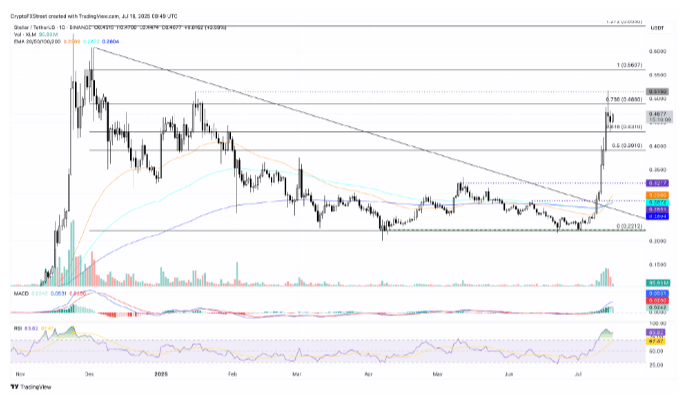 XLM price jumped 18 percent last month after Stellar integrated with PayPal for fiat cards and IBM for cross-border transfers. Block data shows 12.36 K active addresses on Stellar, well above XRP Ledger’s 8.34 K and transaction counts hit 5.20 million on a 7-day average. XLM price also saw a golden cross on July 13 when the 50-day and 200-day EMAs aligned, signaling a fresh bullish trend.