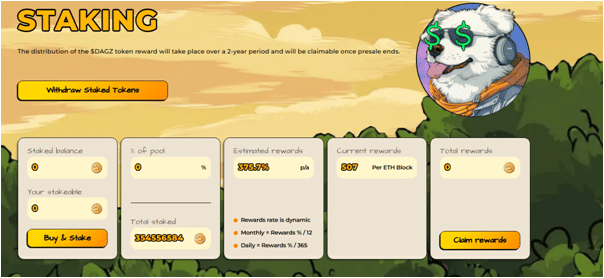 Another way to earn money with Dawgz AI is through staking transactions. You can earn passive income with an annual APY rate of up to 377% by staking the tokens you purchase. In this way, you do not have to wait for the token to increase in price constantly.