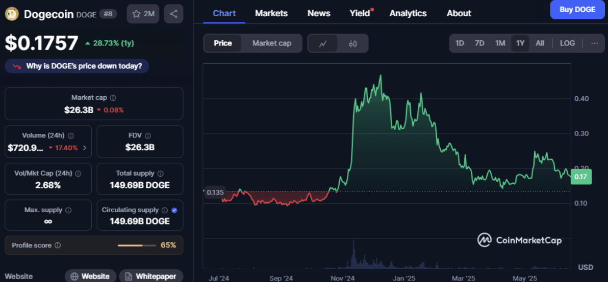Dogecoin is currently priced at $0.1757, with a 28.73% increase in the last 12 months. After peaking above $0.40 earlier this year, DOGE has been in a correction. However, the chart shows long-term accumulation, with a volume-to-market cap ratio of 2.68% and a daily trading volume of $720.9 million.