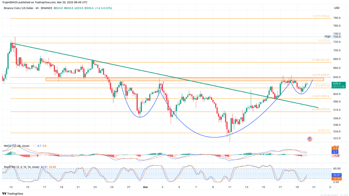 Still, Binance Coin (BNB), the core of the crypto ecosystem, forms the backbone of the Binance exchange and growing ecosystem. Recent price behavior points to BNB’s about to have a positive breakthrough. Currently trading near $640, BNB experienced a temporary pullback after failing to surpass the 61.80% Fibonacci retracement level. Nevertheless, the token has been resilient, bouncing back with a V-shaped reversal and creating four consecutive bullish candles.