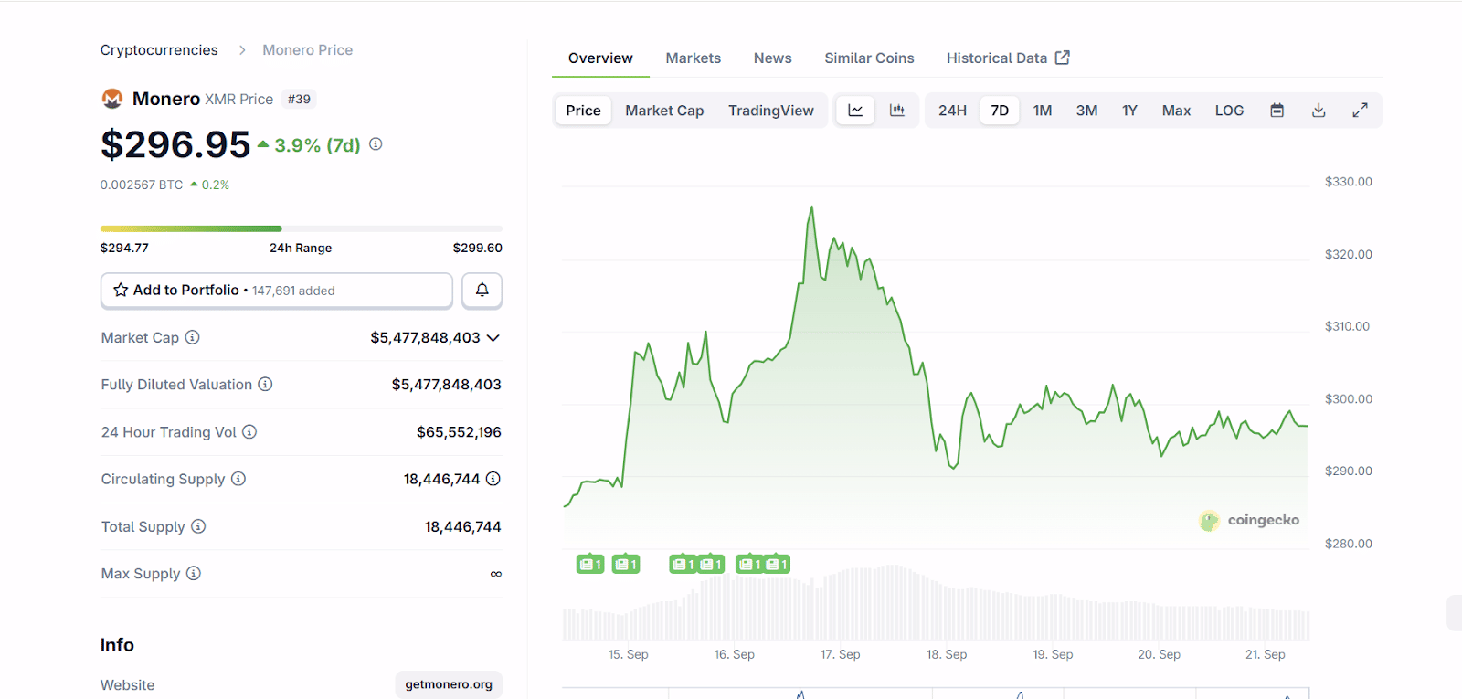 The latest Monero(XMR) price analysis shows the coin trading around $296, holding steady after shedding some gains from earlier in the quarter. Market cap sits at roughly $2.8 billion, with daily trading volumes hovering near $65 million. While the coin still attracts loyal backers for its unmatched privacy features, regulatory attention and exchange delistings keep putting a lid on bigger breakouts. For traders eyeing top crypto assets, this means Monero offers a mix of security and anonymity but lacks the cultural or institutional partnerships other projects are leaning into.