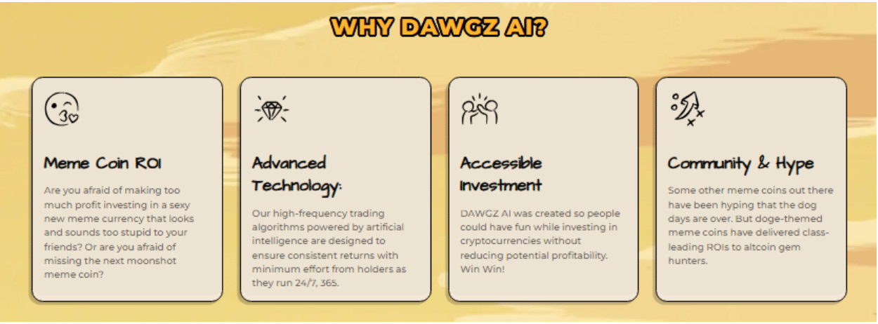 - AI-Powered Trading: Unlike ordinary meme coins, Dawgz AI is backed by advanced AI algorithms designed to optimize trading performance. This technology could help it stand out in a crowded market.