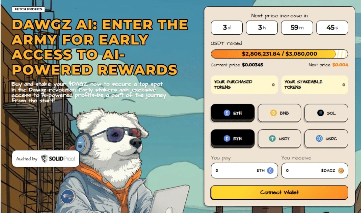 Dawgz AI is currently priced at $0.00345, with the next target set at $0.004. As the presale nears its cap of $3.08 million, anticipation is growing.