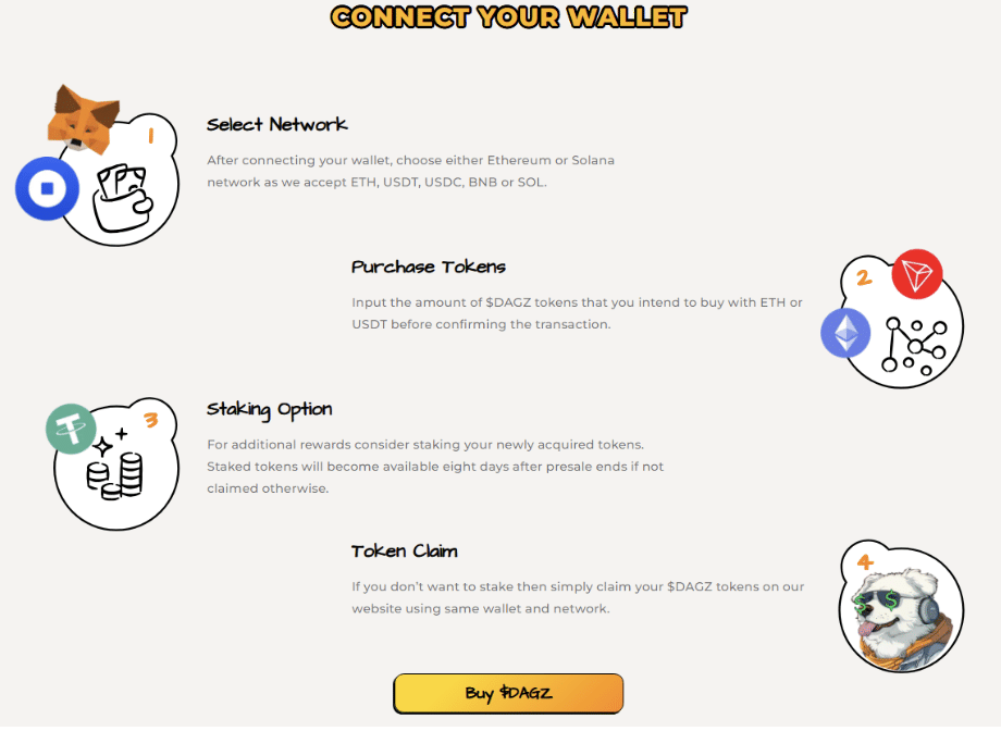Get in early on $DAGZ fast and easy, no matter your experience level – from crypto newbie to seasoned investor. Here’s how to get in the Dawgz AI presale before the next price jump: