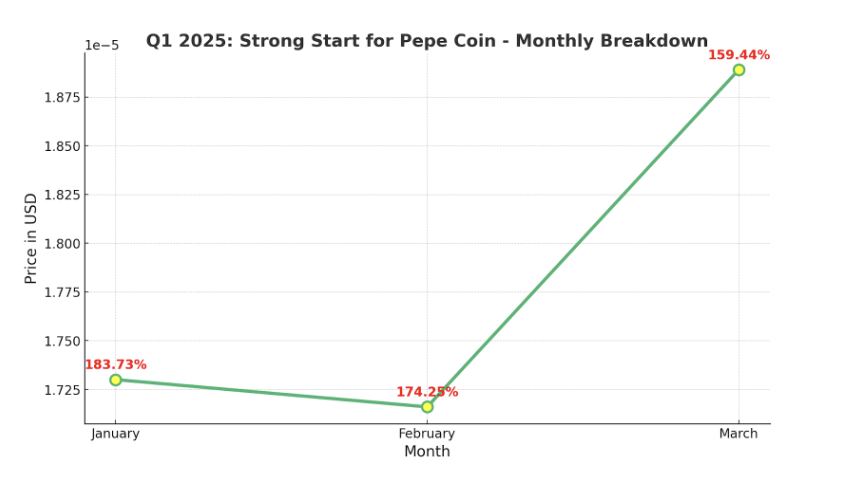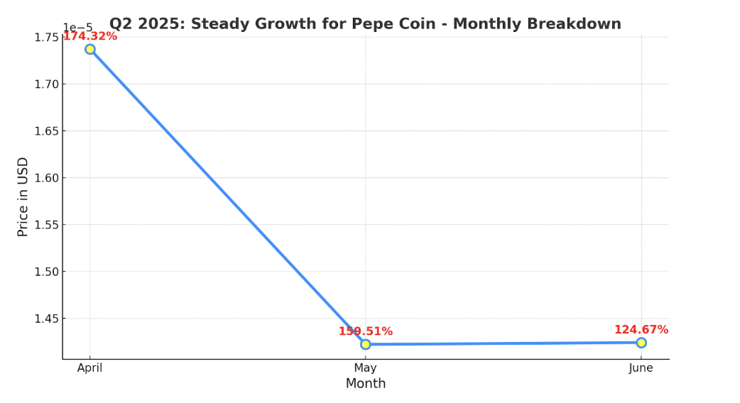 As Q2 approaches, Pepe coin price steadily climbs. In April, it moves up to $0.00001737, followed by $0.00001422 in May.