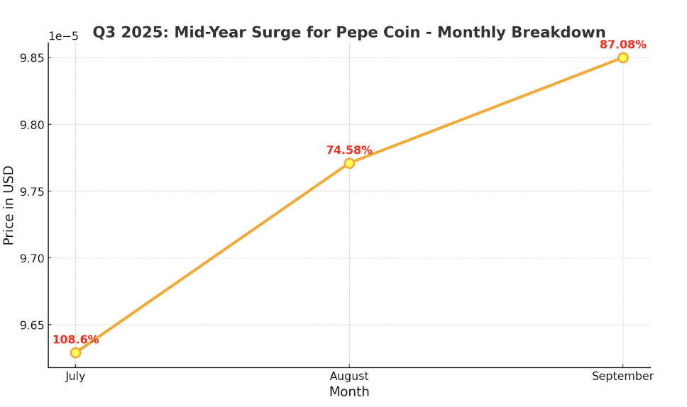 By July, Pepe coin hits $0.09629, with a sharp jump to $0.00001216 in August, maintaining a 108.60% increase.
