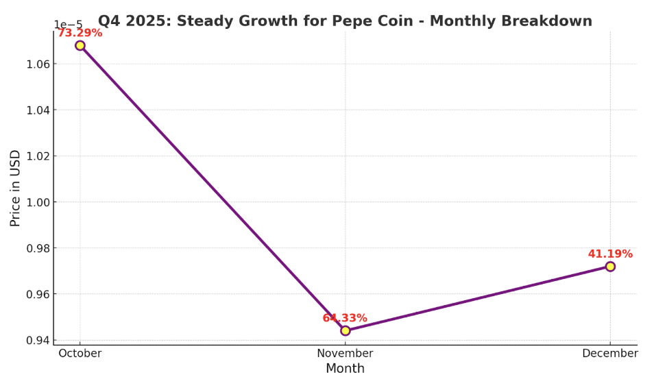 Heading into the final quarter, Pepe price shows slower growth, reaching $0.0009445 in November and $0.0009724 in December.
