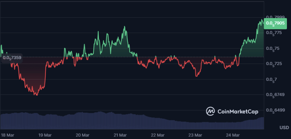 - Support levels: $0.00000765 and $0.0000072