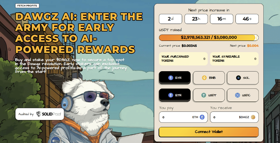 While PEPE makes headlines, smart buyers are also checking out Dawgz AI, a presale token that’s raised over $2.9 million already and combines meme appeal with actual AI utility.