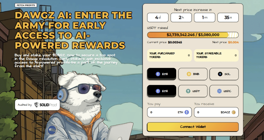 Unlike typical meme tokens, Dawgz AI blends fun meme culture with real-world utility – using automated AI-powered trading bots for consistent profits and offering passive income through ETH staking.