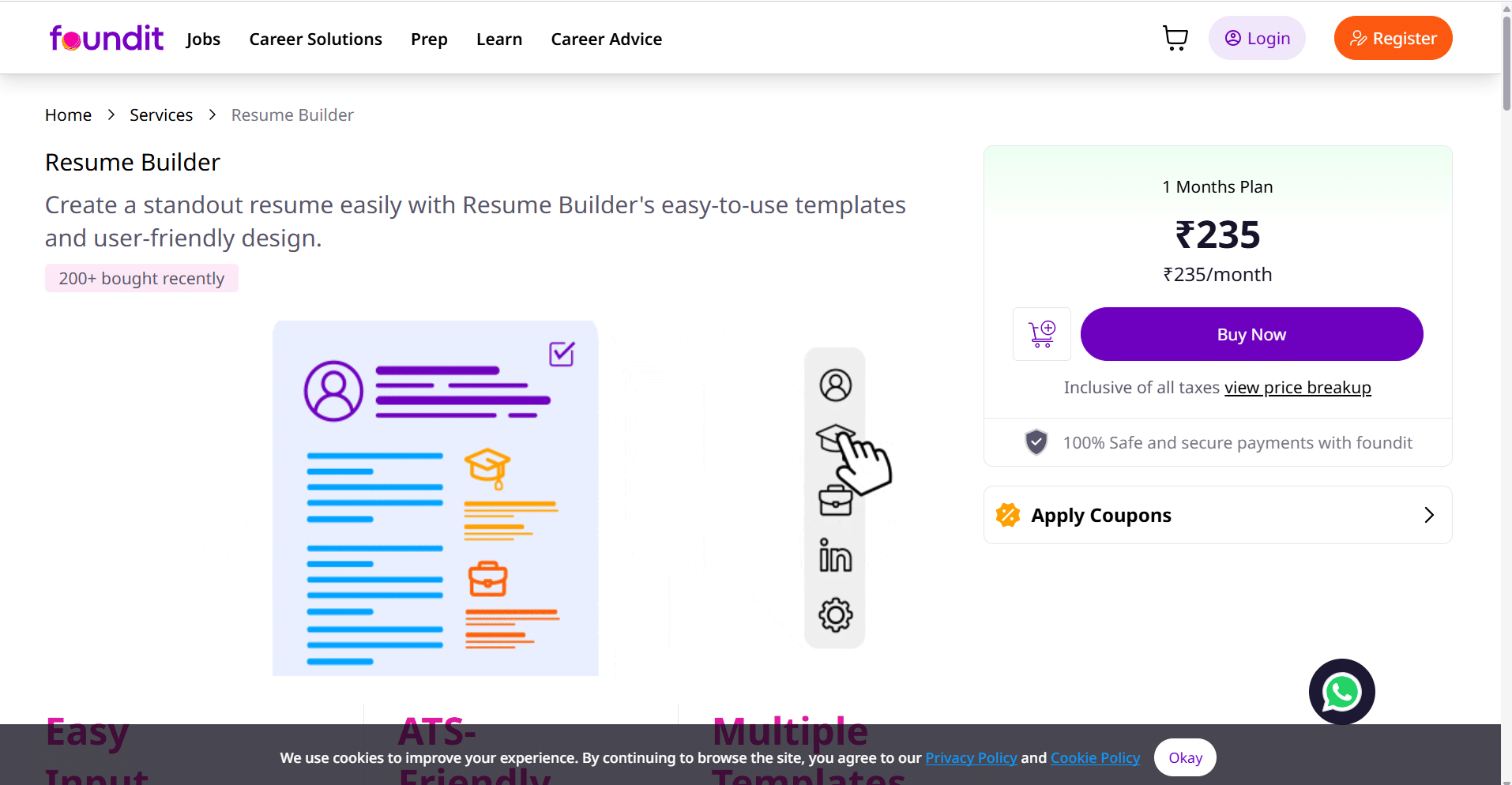 Pricing: Starts at ₹890 for resume visibility and job-search enhancement services.