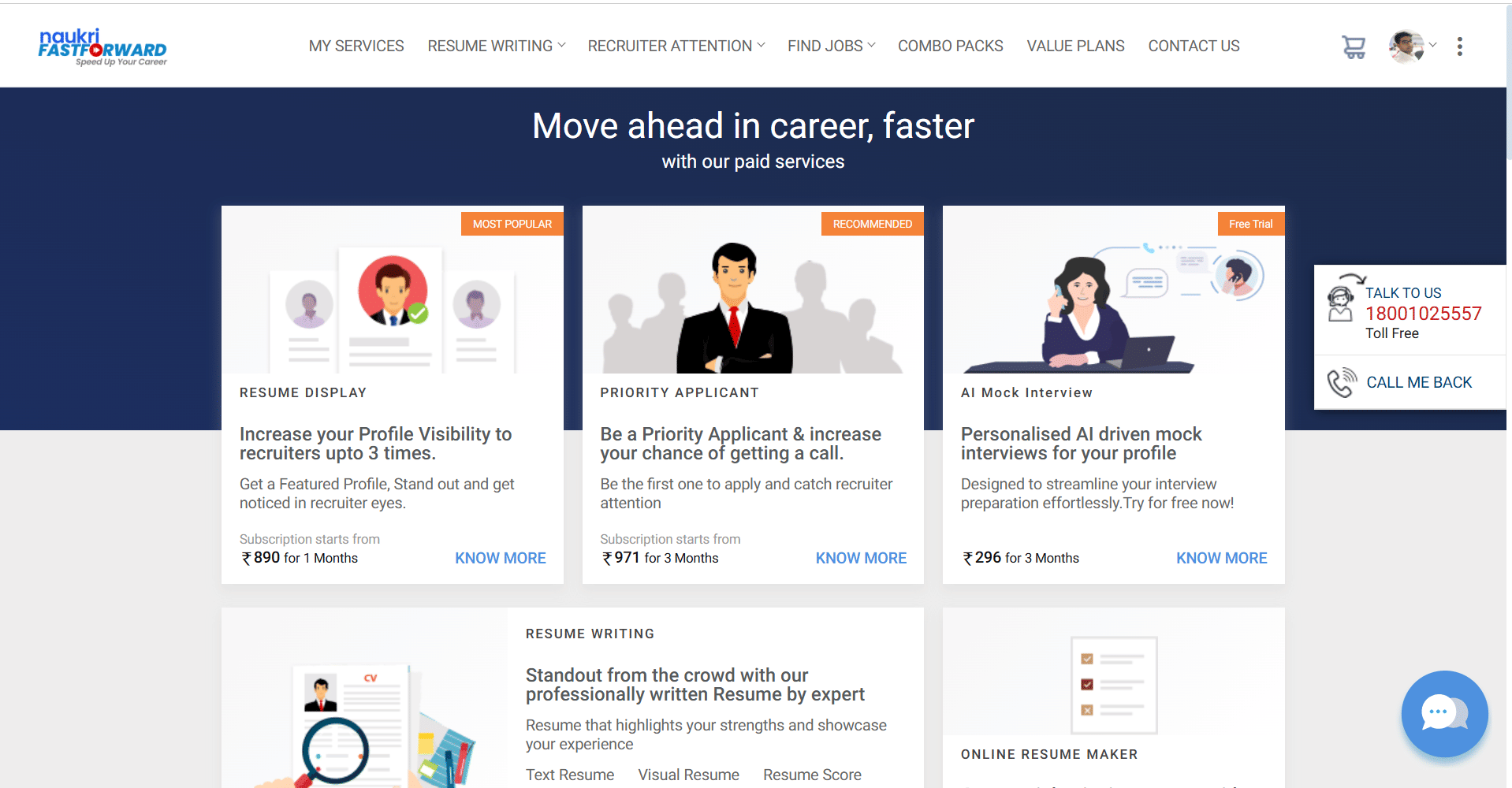 Pricing: Starts at ₹1,525 for resume writing services.