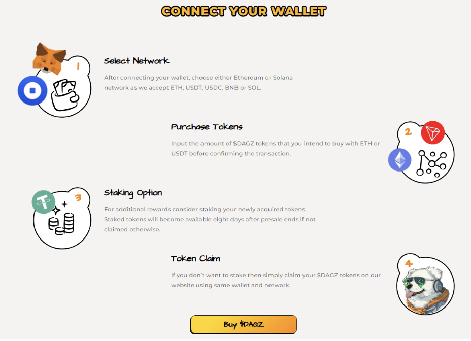 - Buy $DAGZ Tokens – Enter the amount you’d like to invest and confirm the transaction, your tokens will be secured in your wallet.