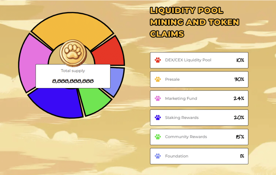 - Only 8.888B tokens in total supply, with 30% in presale, 20% for staking, and 10% for liquidity.