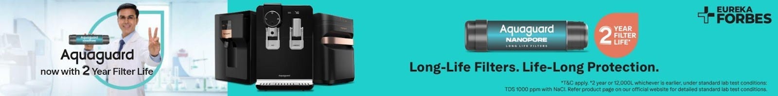 Some modern water purifiers, like the ones from Aquaguard, combine all these factors with the advantage of a 2 Year Filter Life. Powered by advanced Nanopore Long-Life Filters, it ensures full 2-year protection against harmful pollutants, so every glass of water is as pure as it should be.