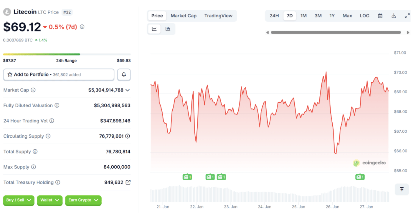 Litecoin continues to trade as a mature, liquidity-rich asset, but recent price behavior shows limited momentum. As of late January 2026, the Litecoin price is hovering near $69, moving inside a tight $67.8 to $70 range. Market capitalization sits near $5.3 billion, placing Litecoin around the lower end of the top thirty cryptocurrencies.