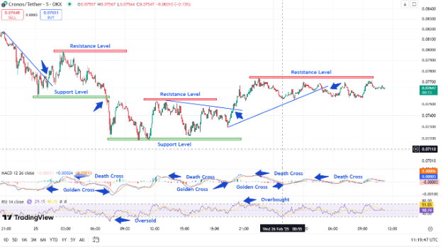 As illustrated in Chart 1, the trading day on February 25, CRO kicked off with a notable uptrend, projecting an upward trajectory. At 02:50 UTC, a pin bar, followed by a full-body red candle, signaled a sharp price decline at this resistance level. As expected, CRO began to fall, broke the support at $0.07564, and dropped to $0.07195. A Death Cross on MACD at 03:20 UTC confirmed this downtrend. However, at 07:35, CRO found support at $0.07195 and entered the phase of the trading range. A Golden Cross on MACD at 07:55 reasserted this trend reversal.