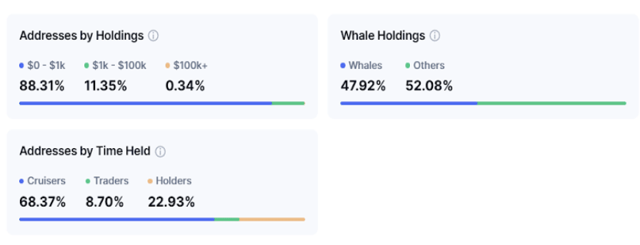 Critics point to Pepe’s lack of utility, but also its holding address composition. Specifically, the asset has always been dominated by whales and cruisers. A massive 47.92% of PEPE’s total supply is held by whales, while 68.37% is locked up by cruisers (mid-term holders). This means a handful of big players control the market, making PEPE super volatile.