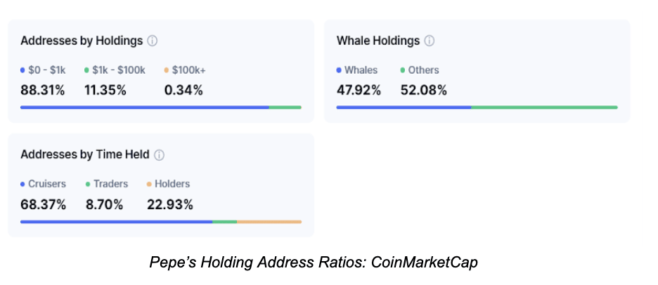 Critics point to Pepe’s lack of utility, but also its holding address composition. Specifically, the asset has always been dominated by whales and cruisers. A massive 47.92% of PEPE’s total supply is held by whales, while 68.37% is locked up by cruisers (mid-term holders). This means a handful of big players control the market, making PEPE super volatile.