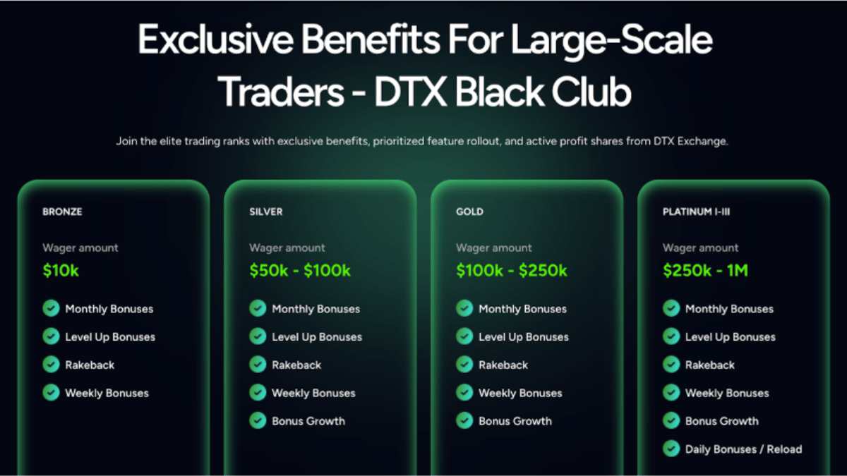 The DTX Black Club provides exclusive benefits for investors looking to increase their investments. It ensures that high-volume traders are rewarded. Additionally, the exchange was created to benefit both beginners and pro traders.