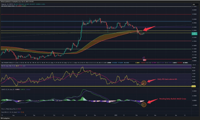 The chart showcases a well-known metric, the Bitcoin Bull Market Support Band, applied to Dogecoin. The band is the 20-week Simple Moving Average (SMA) and the 21-week Exponential Moving Average (EMA), sitting at $0.282- $0.286 for Dogecoin’s current configuration. Price went under this band last week, and now the resistance zone is between $0.27 and $0.29. The RSI is close to 38, above the critical support area of approximately 27. Kevin suggests that this might be an early indication of a sentiment shift in case of some follow-through buying. The MACD line is moving towards the signal line, and if this crossover is validated, it could propel Dogecoin upward. Nonetheless, the predicted increase in Dogecoin’s value is mostly based on hope. Therefore, there is no plausible reason to expect it to achieve the $2.5 target price without genuine usage or ecosystem development.