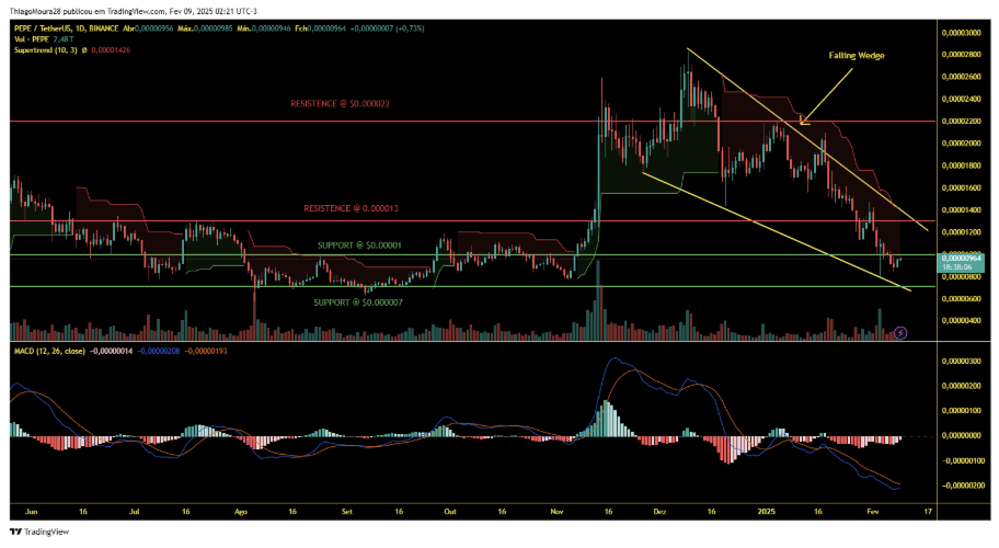However, the Pepe price prediction 2025 according to market technical analysis is that the $PEPE token price of $0.0000095 will remain close to resistance levels between $0.000013 and the maximum price of $0.000017. This means an increase of 38% to 79%, considering its bearish momentum for February and a more stable trend for the long term. Traders who are keeping an eye on the memecoin with uncertainty about whether to invest or not, need to wait for the pattern to break out before placing a buy order with a minimum price of $0.000007.